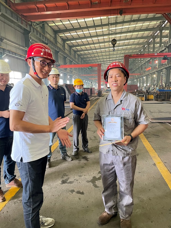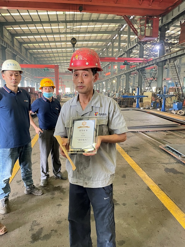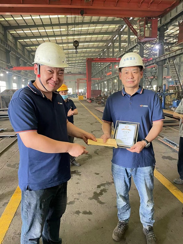 6月2日上午11時,天奇藍天公司在生產(chǎn)現(xiàn)場召開了一場表彰大會。 首先,由公司總經(jīng)理助理施樂勤對五月份在“先進班組”考核中優(yōu)勝的“下料車間曹軍班組”和“裝配朱長生班組”授予了先進班組流動紅旗和獎金,并對2021年受股份公司表彰的“優(yōu)秀員工”阮德明、朱風(fēng)巧及“崗位標(biāo)兵”谷昆明、姚鎮(zhèn)四名同志頒發(fā)榮譽證書和獎金。 企業(yè)穩(wěn)健發(fā)展離不開全體員工的辛勤付出,希望受表彰的優(yōu)秀員工,戒驕戒躁,發(fā)揮模范作用,在今后的工作中再接再厲、全力以赴、爭創(chuàng)佳績。愿和諧、互勉、共同進步的氣氛長存;讓企業(yè)文化扎根在每一位員工的心中。