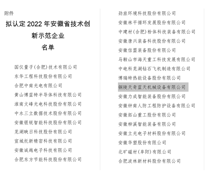 據(jù)悉:在日前安徽省經(jīng)濟(jì)和信息化廳公示的“關(guān)于2022年安徽省技術(shù)創(chuàng)新示范企業(yè)擬認(rèn)定名單”中,銅陵天奇藍(lán)天名列其中。此次榮獲該榮譽(yù),是對公司前期技術(shù)創(chuàng)新工作的肯定和褒獎(jiǎng)。同時(shí)也將激勵(lì)我們緊盯行業(yè)前沿技術(shù),不斷加大團(tuán)隊(duì)建設(shè)和資金投入以提升公司的核心競爭力及市場影響力。促進(jìn)持續(xù)發(fā)展,推動(dòng)科學(xué)技術(shù)進(jìn)步,力爭我司在技術(shù)創(chuàng)新領(lǐng)域取得更大成果。